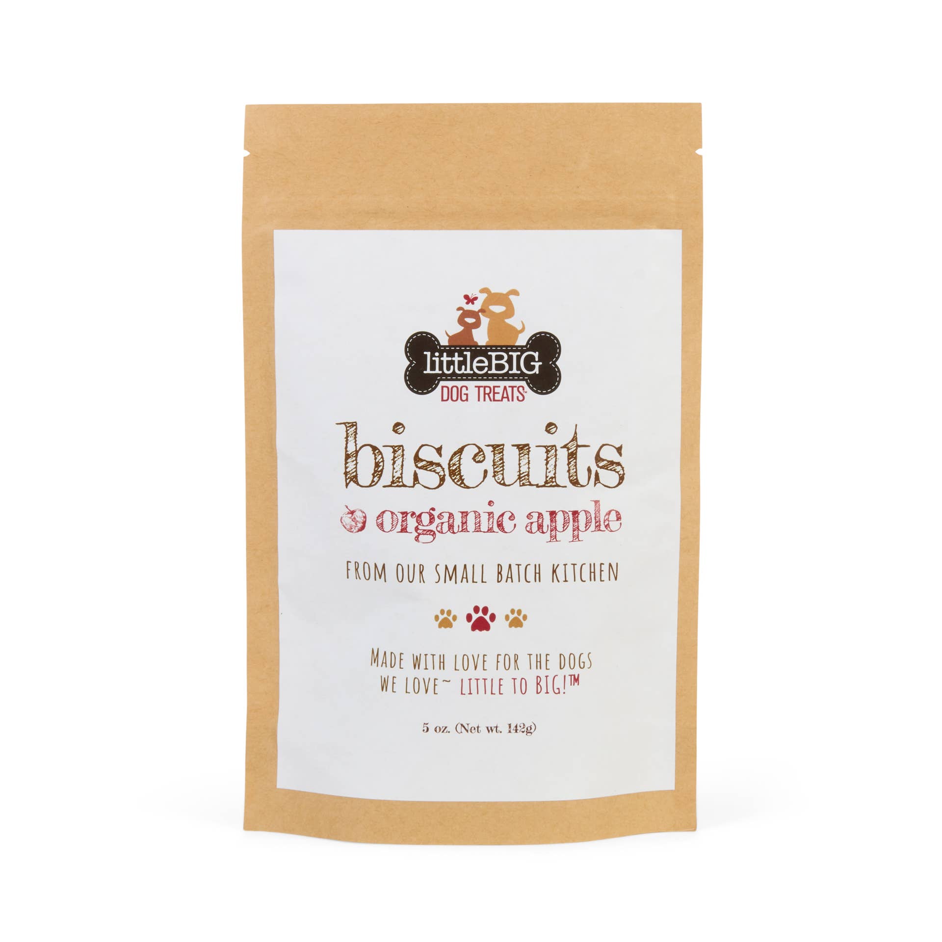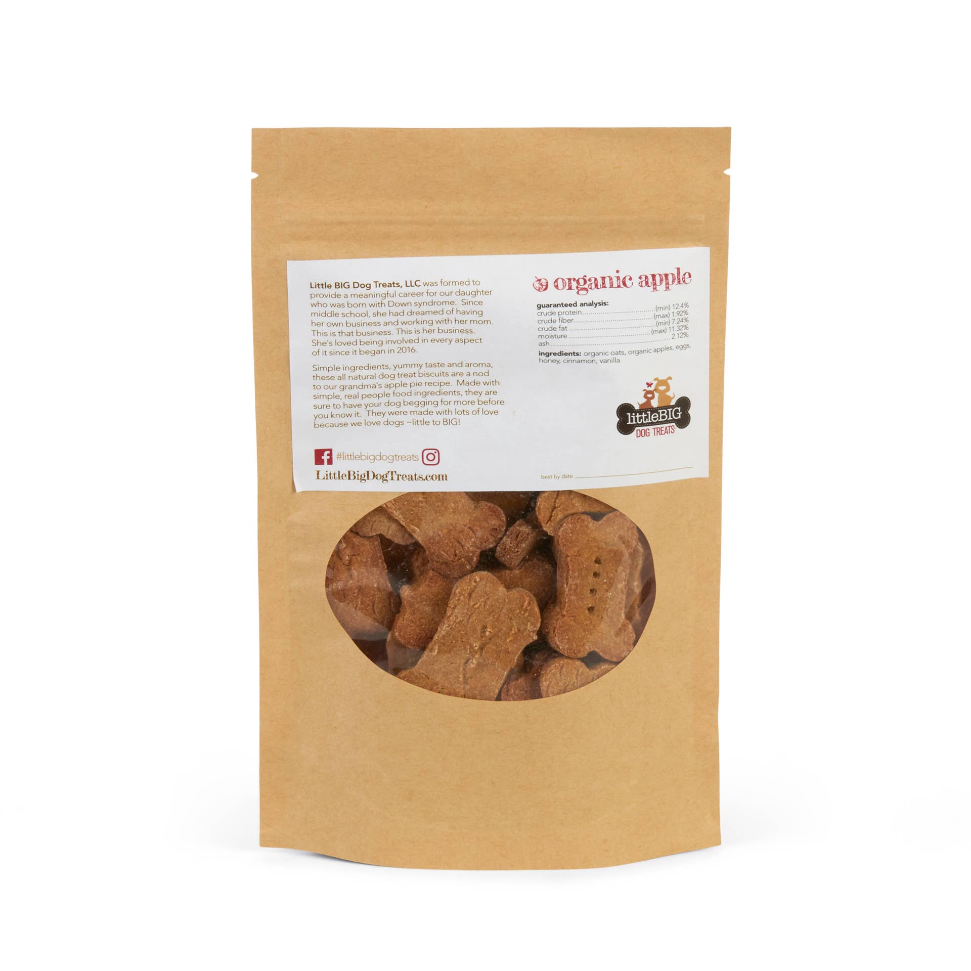 Five fresh, real food ingredients make up these tasty treats: Oats, Organic Apples, Molasses, Organic Cinnamon, Real Eggs. No flavor enhancers, no preservatives, no artificial anything. Each batch of our dog treats are handmade in small batches with lots of care and love ~ for the dogs we love!